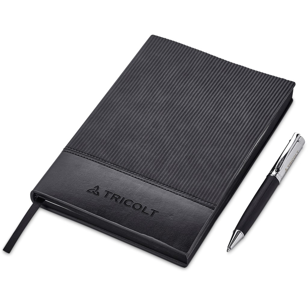 The soft, ribbed cover of this Notebook from Alex Varga gives it a luxuriously tactile feel. The bottom panel is designed to be subtly debossed with your logo or message. It’s well paired in a 2-piece gift box with a metal Alex Varga ball pen with a line-textured lower barrel and chromed upper barrel.