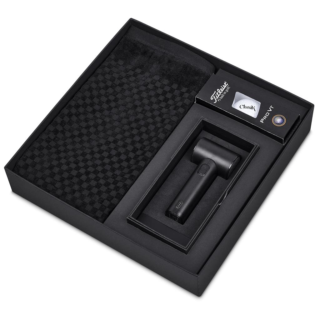 This premium golf gift set is an ideal choice for corporate gifting and golf events. The set includes an Alex Varga cotton golf towel and a five‑speed rechargeable handheld fan, presented in a two‑piece presentation box. Each set is completed with a sleeve of three golf balls, allowing the recipient to select the option best suited to their performance preferences and budget.  A sophisticated and functional gift set designed to appeal to golfers of all levels while delivering excellent perceived value. The range is offered in a structured good, better, best pricing tier, providing a clear choice and flexibility: