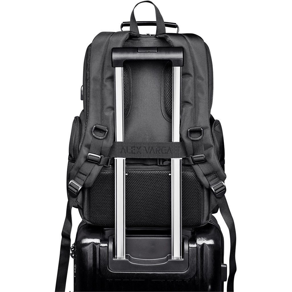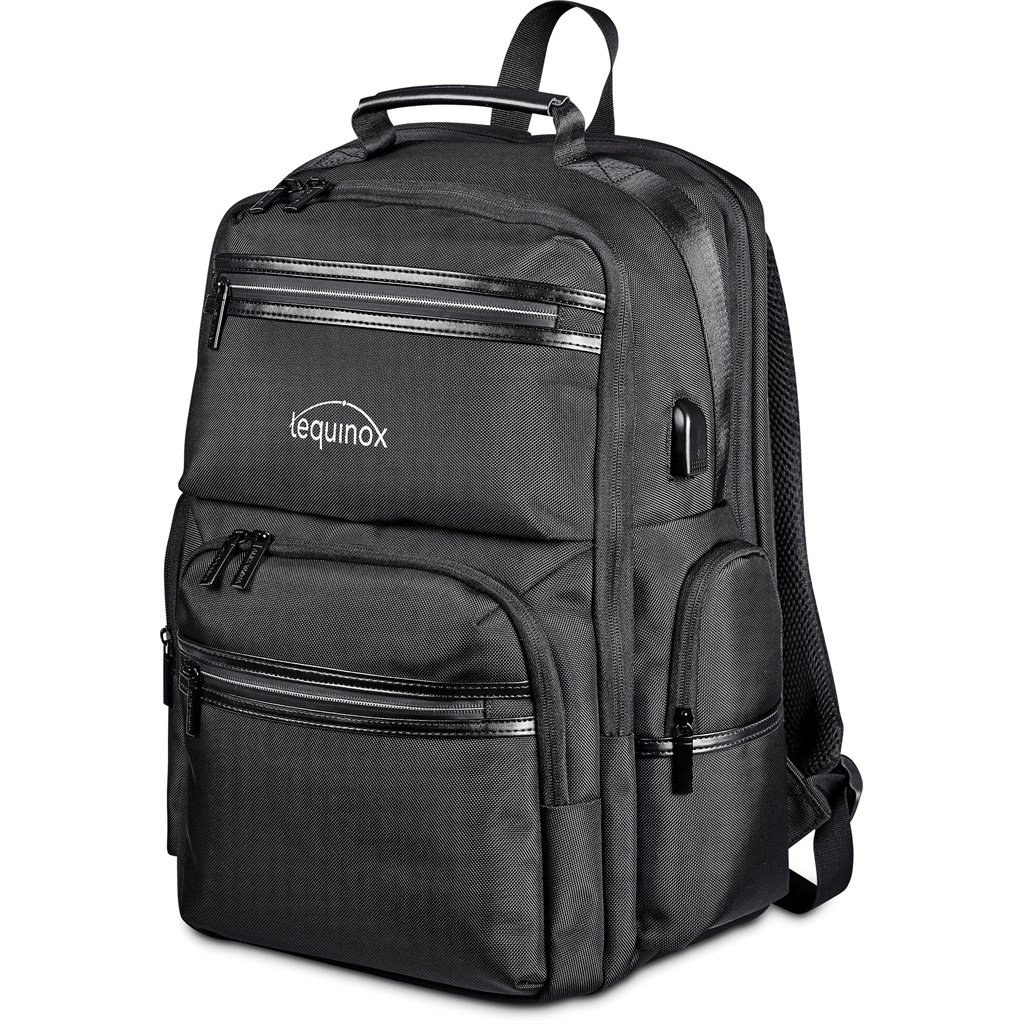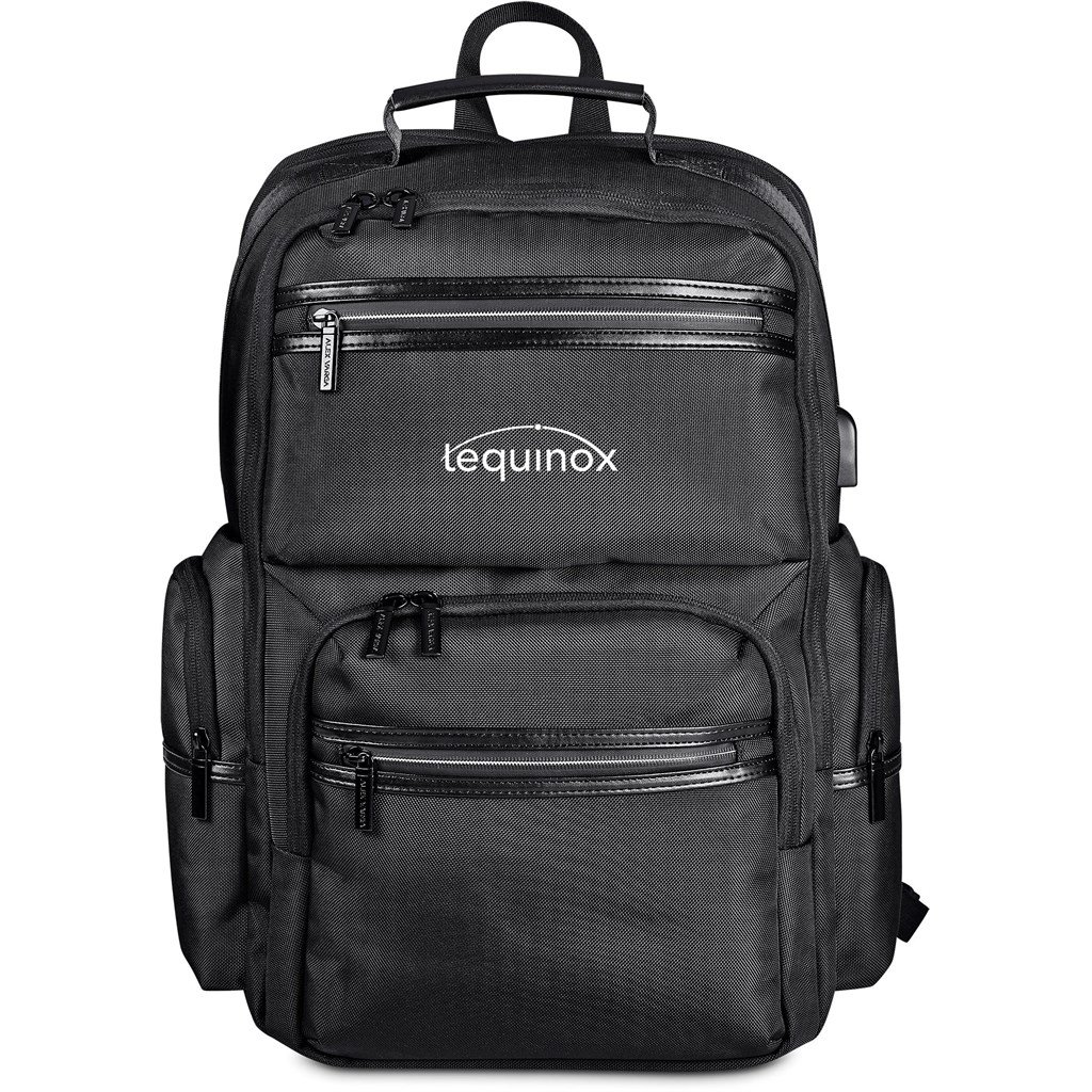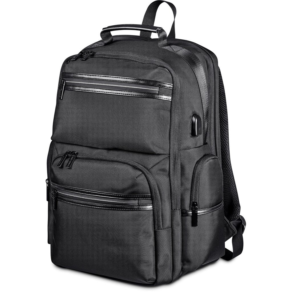 A fully-loaded, large laptop backpack for travel and daily use. The strong, durable fabric and the re-enforced padding on the back panel gives comfort and support when you’re carrying a heavy load. The bag is kitted with numerous zip pockets for safe and organised storage, and a USB charging port to charge your phone on the go. The concealed back zip pocket is a feature for quick access to your safely stored travel documents.