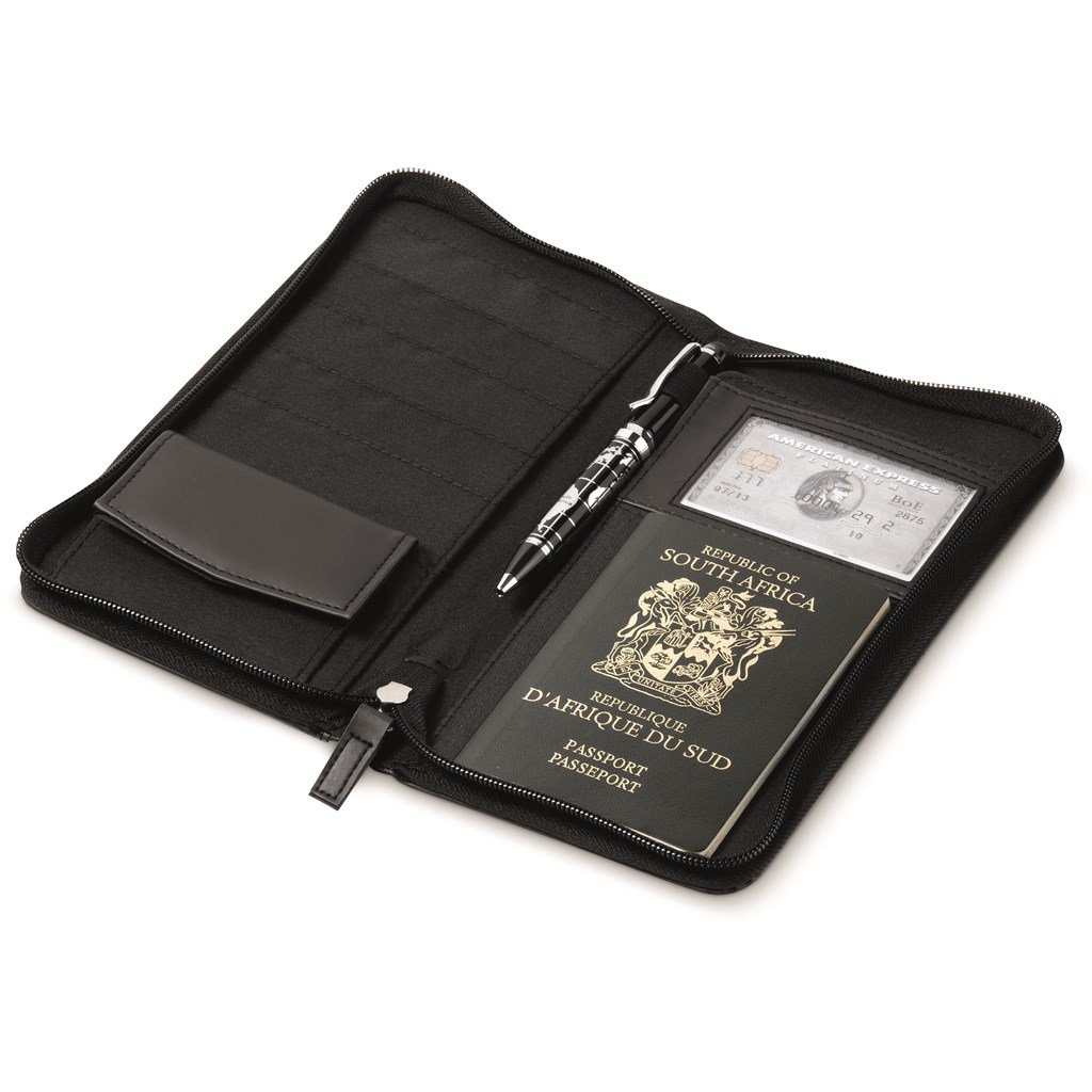 Elegant and convenient travel wallet with zippered closure to keep all your travel documents safe and easily accessible.