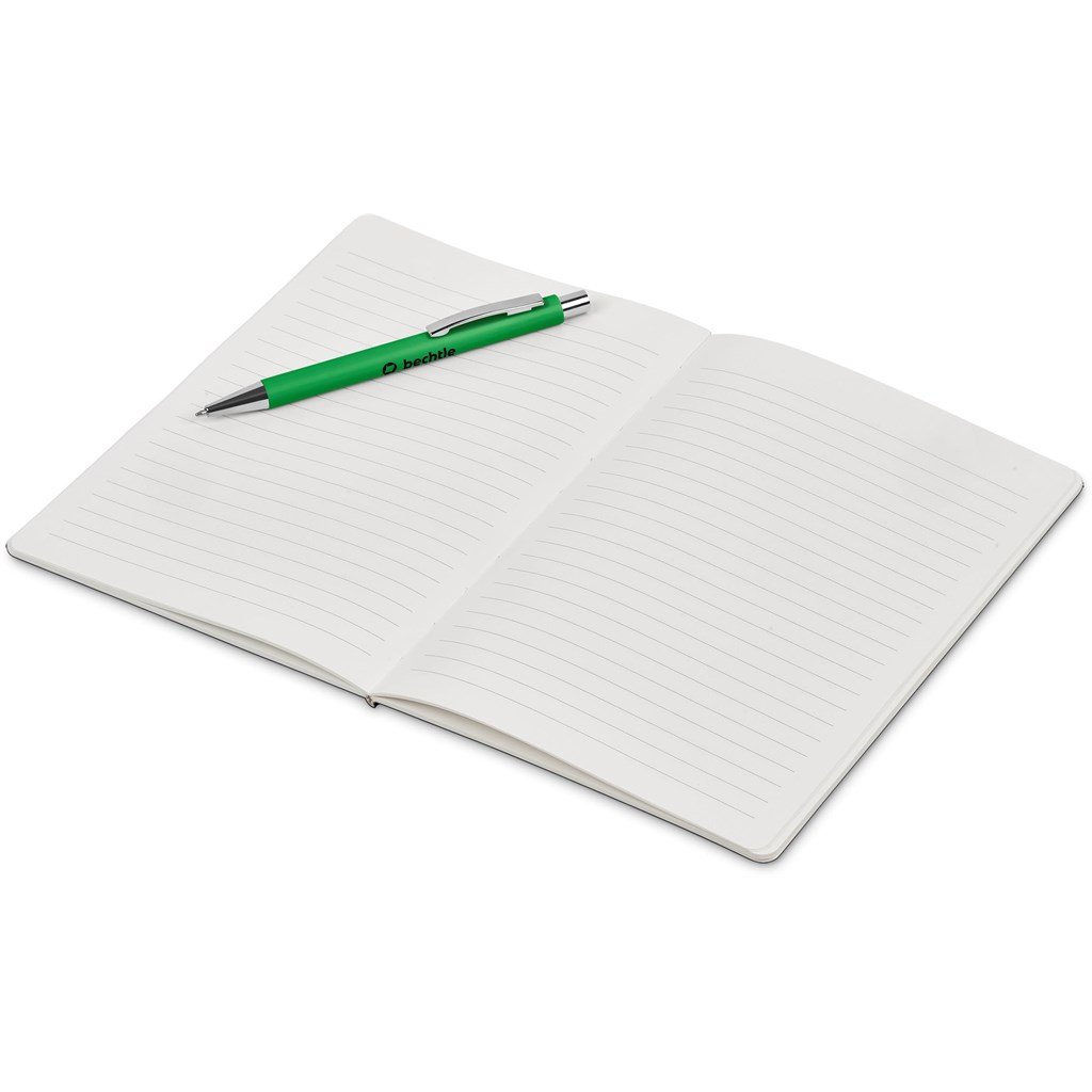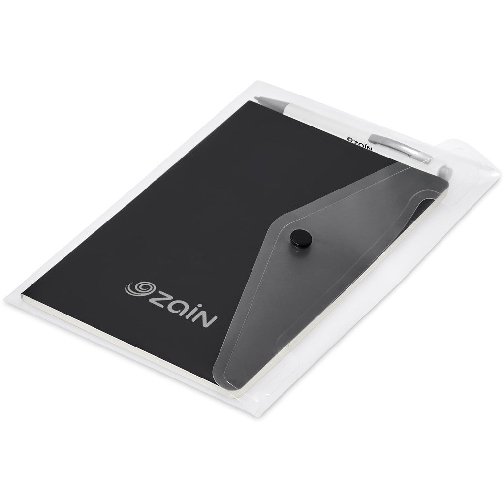 An economical notebook and pen set, especially suited for meetings, conferences and events. Packaging the notebook and pen in a pouch makes it easy to transport and to distribute these writing sets. This set consists of a black A5 notebook with a pen available in a variety of colours. The pouch has a stud button closure, and it’s made predominantly from recycled material.