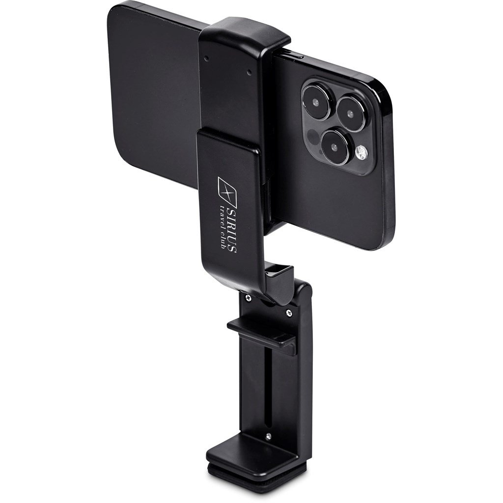 This innovative and versatile phone stand can be used in multiple ways and positions. The flexible phone bracket will securely hold phones of varying size. The bottom bracket is also adjustable, to be attached to a desk or table. It’s especially useful when flying, as it can be attached to your seat tray, whether the tray is up or down. The bracket and arm can also be adjusted to various positions and angles.