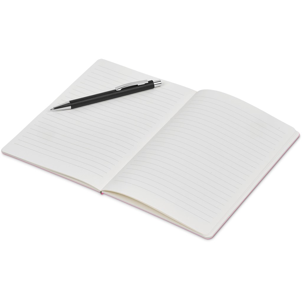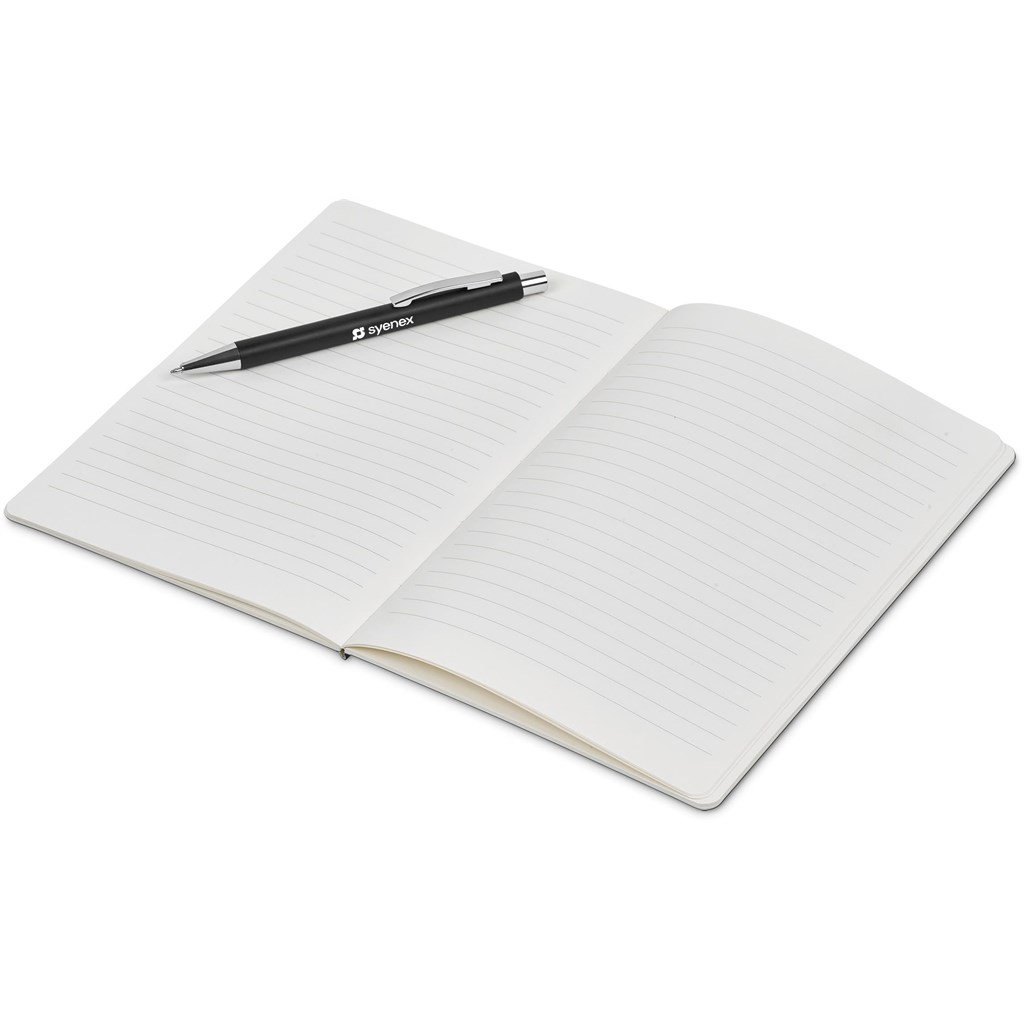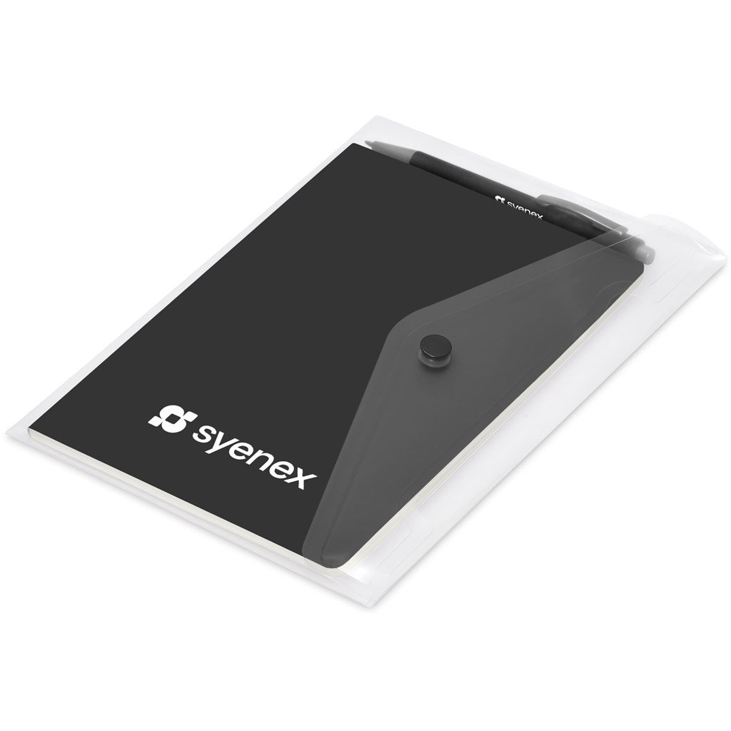 An economical notebook and pen set, especially suited for meetings, conferences and events. Packaging the notebook and pen in a pouch makes it easy to transport and to distribute these writing sets. This set consists of a black pen with an A5 notebook available in a variety of colours. The pouch has a stud button closure, and it’s made predominantly from recycled material.