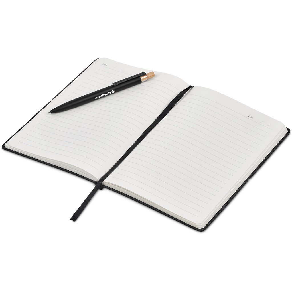 A tactile, soft cover notebook made from recycled single-use plastic bottles and FSC certified, sustainable paper is paired with a ball pen made from recycled aluminium. They are presented together in a 2-piece natural kraft Okiyo presentation box.