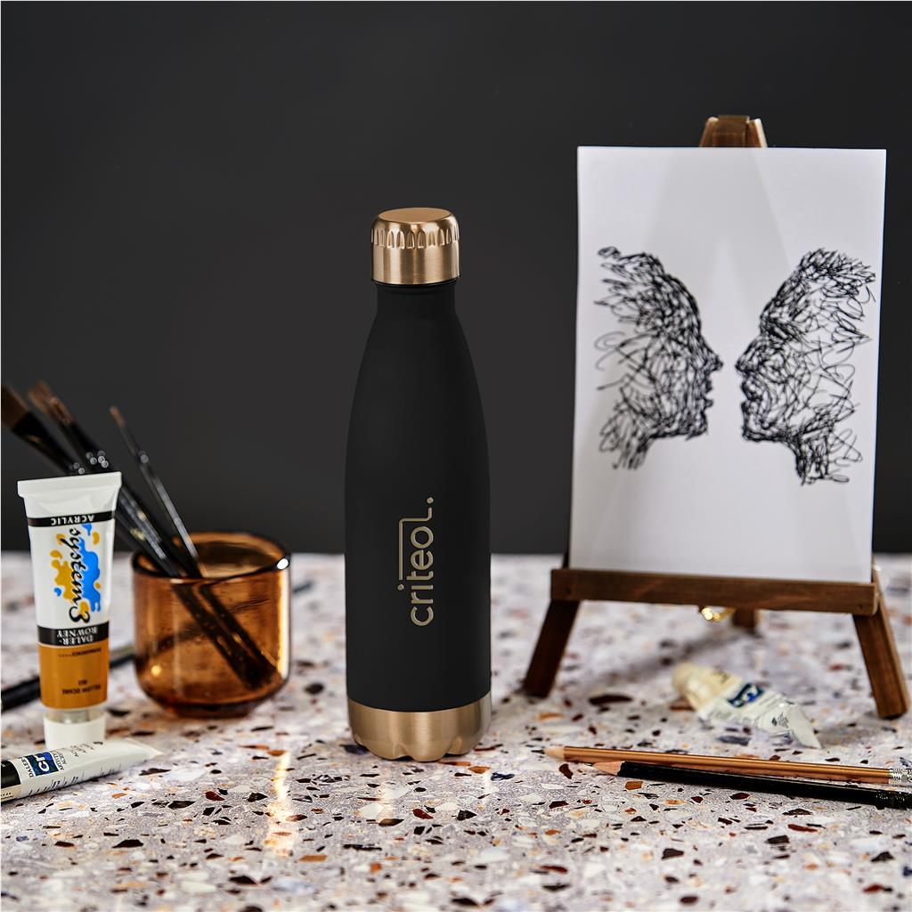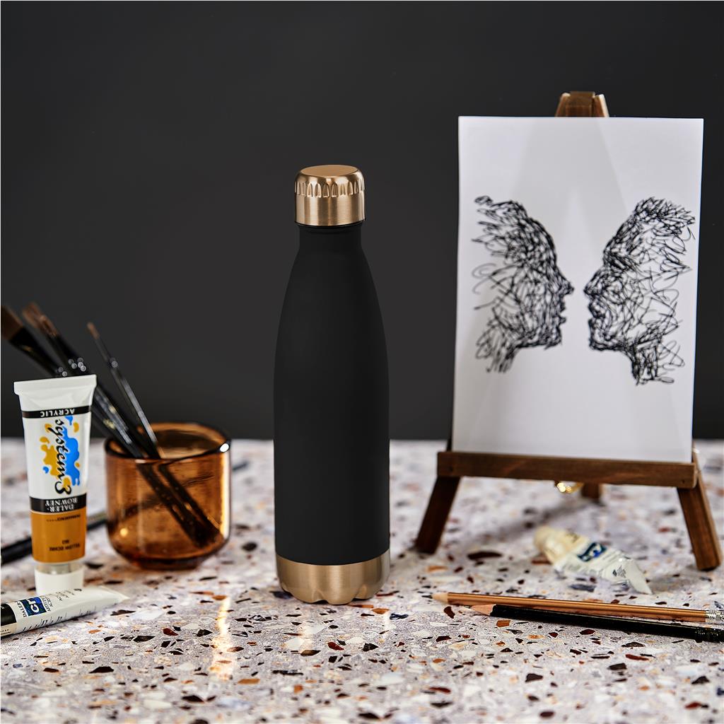 The double-wall vacuum construction of this 500ml bottle will keep liquids hot or cold for hours. This bottle has a rubberised black finish and a gold colour lid and base, which gives it the perfect balance between fashion and function.
