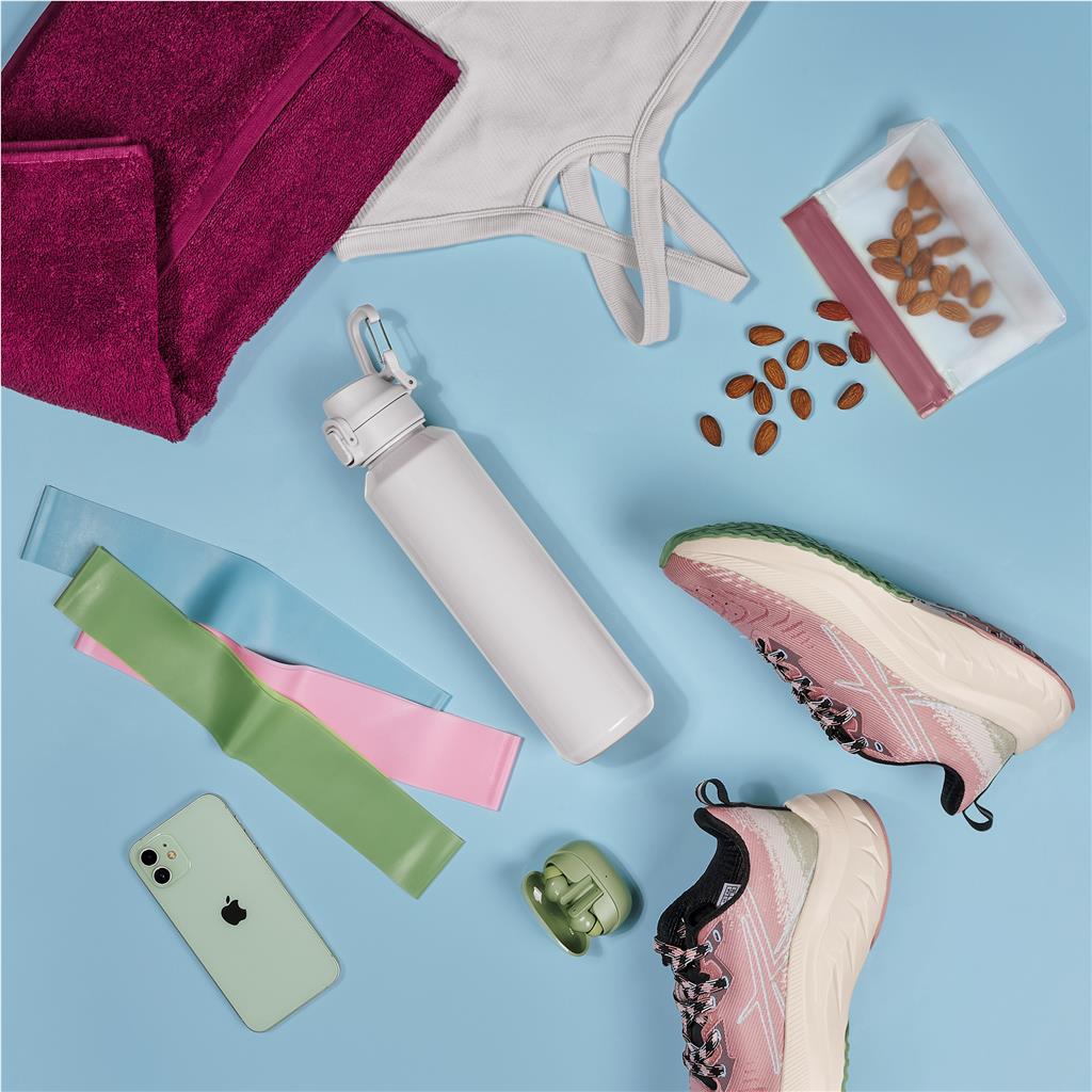 The body of this water bottle is made from BPA-free, food-grade recycled single-use plastic. It’s lightweight and easy to carry, and you can clip it onto your bag with the included clip attachment. The lid features a lock mechanism to keep it securely closed and a flip-top button to easily open the lid when you need a drink.